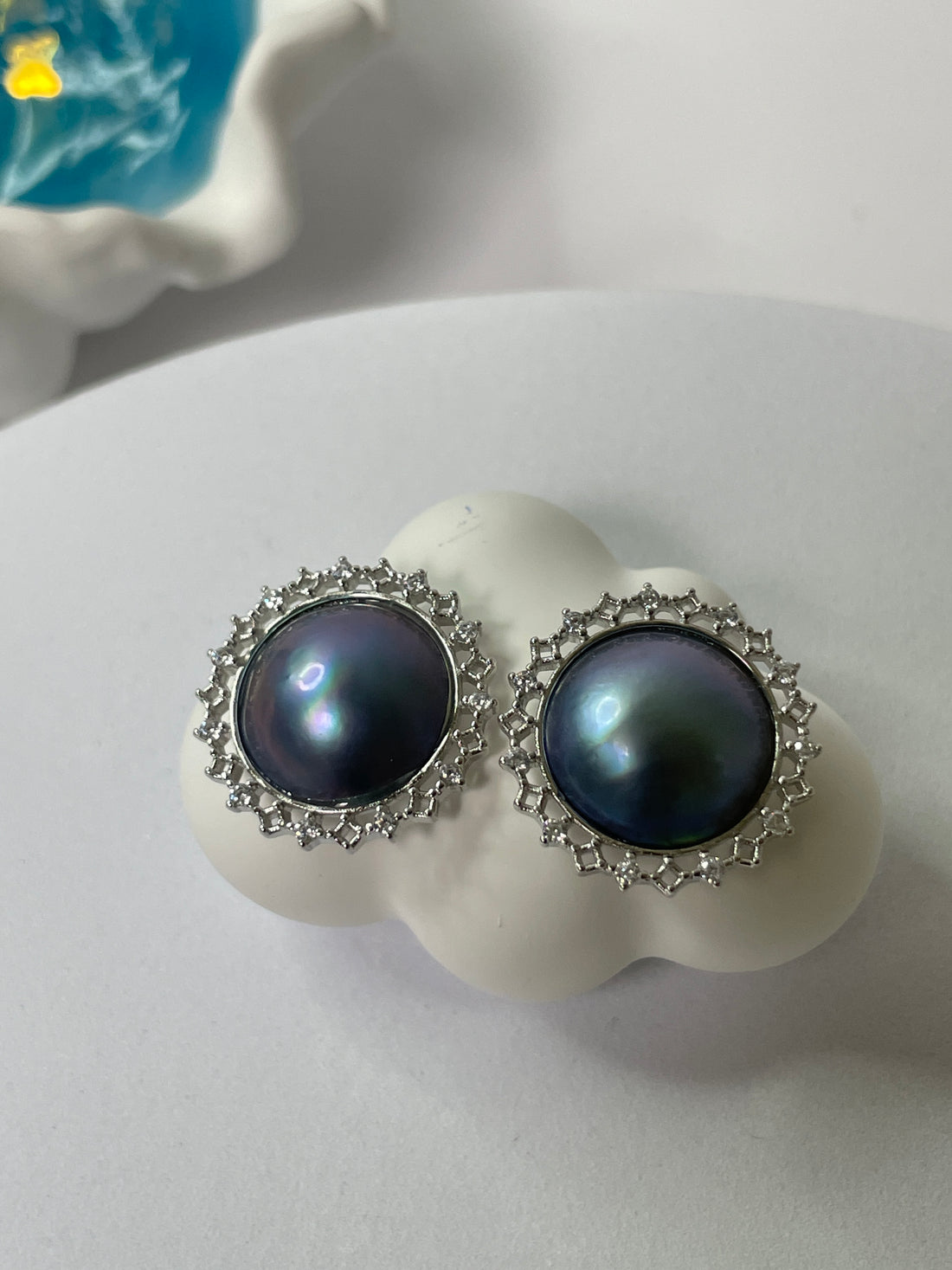 Mabe Pearl Earrings | 15–16mm · Blue Ocean Hue · High Luster · S925 Filigree Halo Design