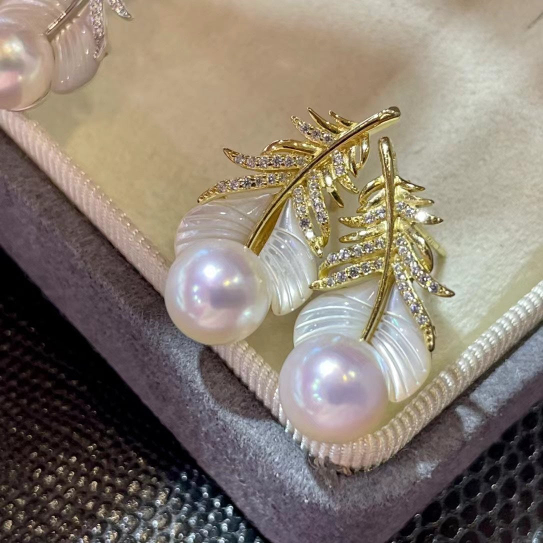 Akoya Pearl Earrings with Olive Leaf Design | S925 Sterling Silver · Zircon Accents