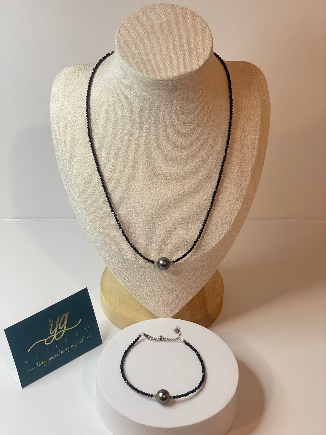 Tahitian Pearl Necklace & Bracelet Set | 9–10mm · Round · High Luster · Spinel Design · S925 Silver