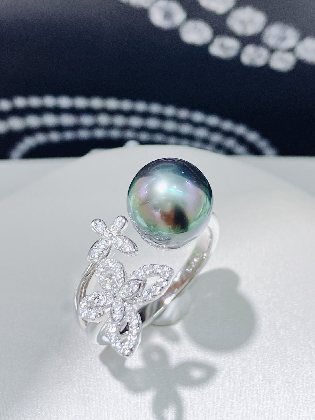 This enchanting ring features a Tahitian pearl of 8–9mm, nearly flawless, set on a butterfly-shaped base...