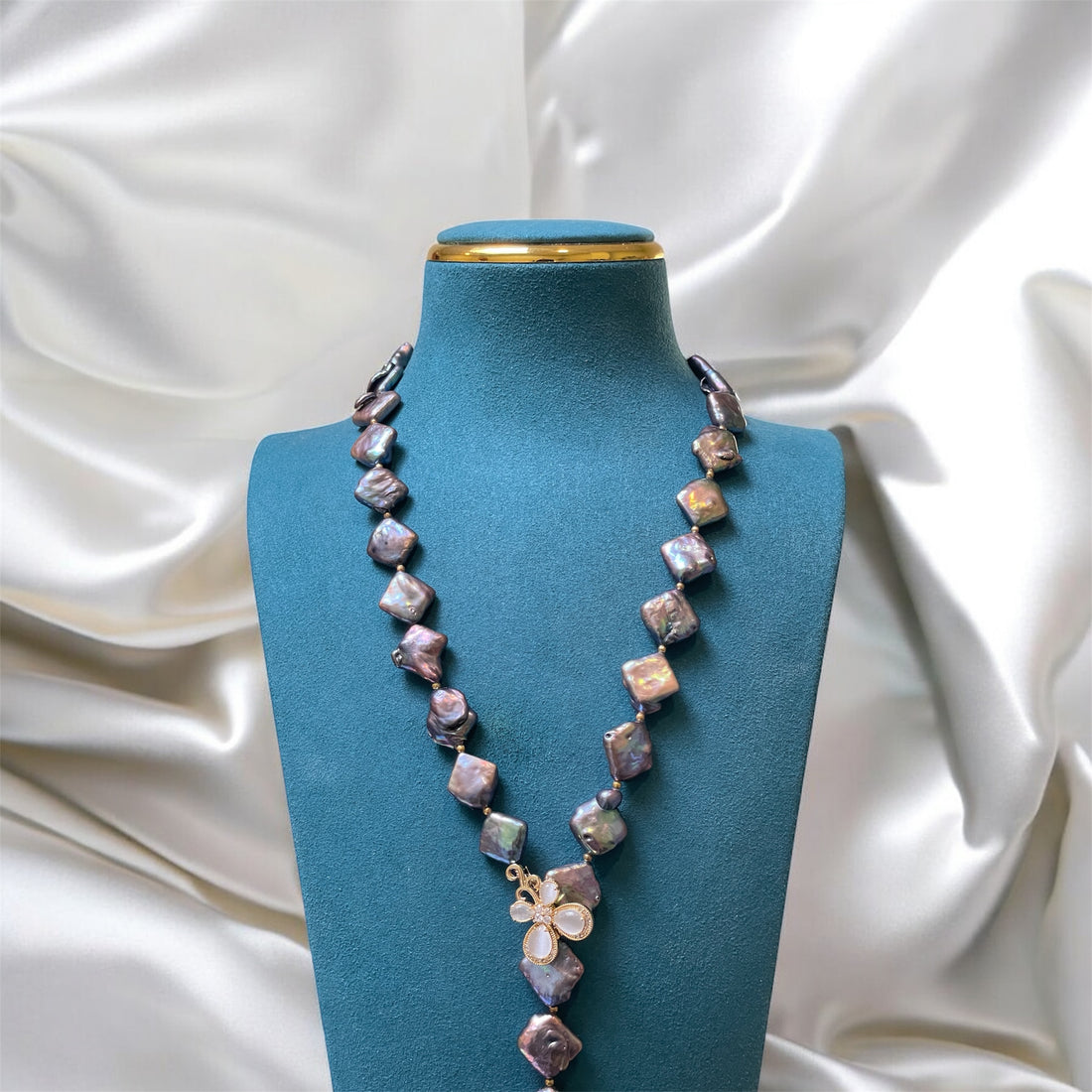 This sweater necklace features 37 square-shaped, artificially cultured pearls, each treated with precision laser color...