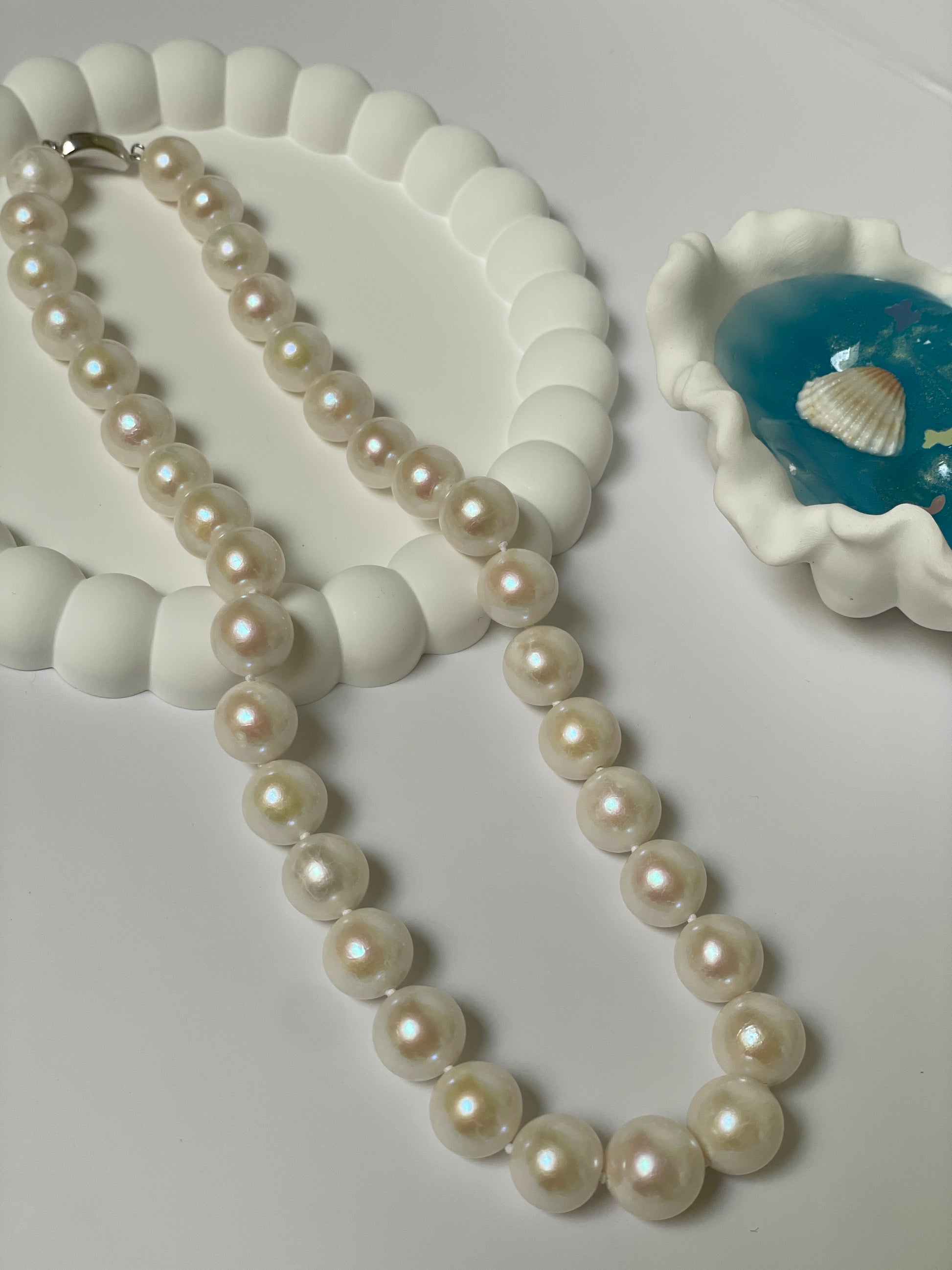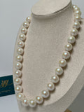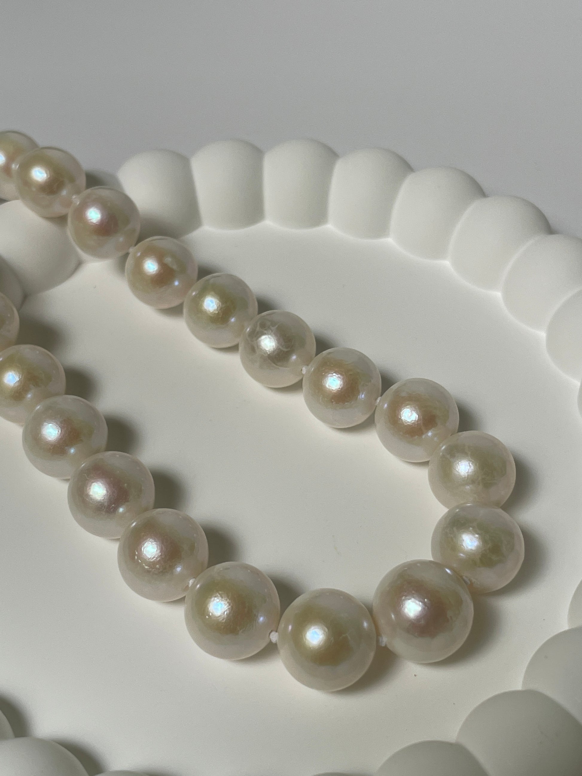 This striking necklace features 35 large freshwater pearls in the impressive 11–13mm size range, each with a near-round shape and a soft golden overtone. Minor natural blemishes are present but invisible at social distance, preserving the necklace’s refined beauty while showcasing the authentic character of sizable pearls.