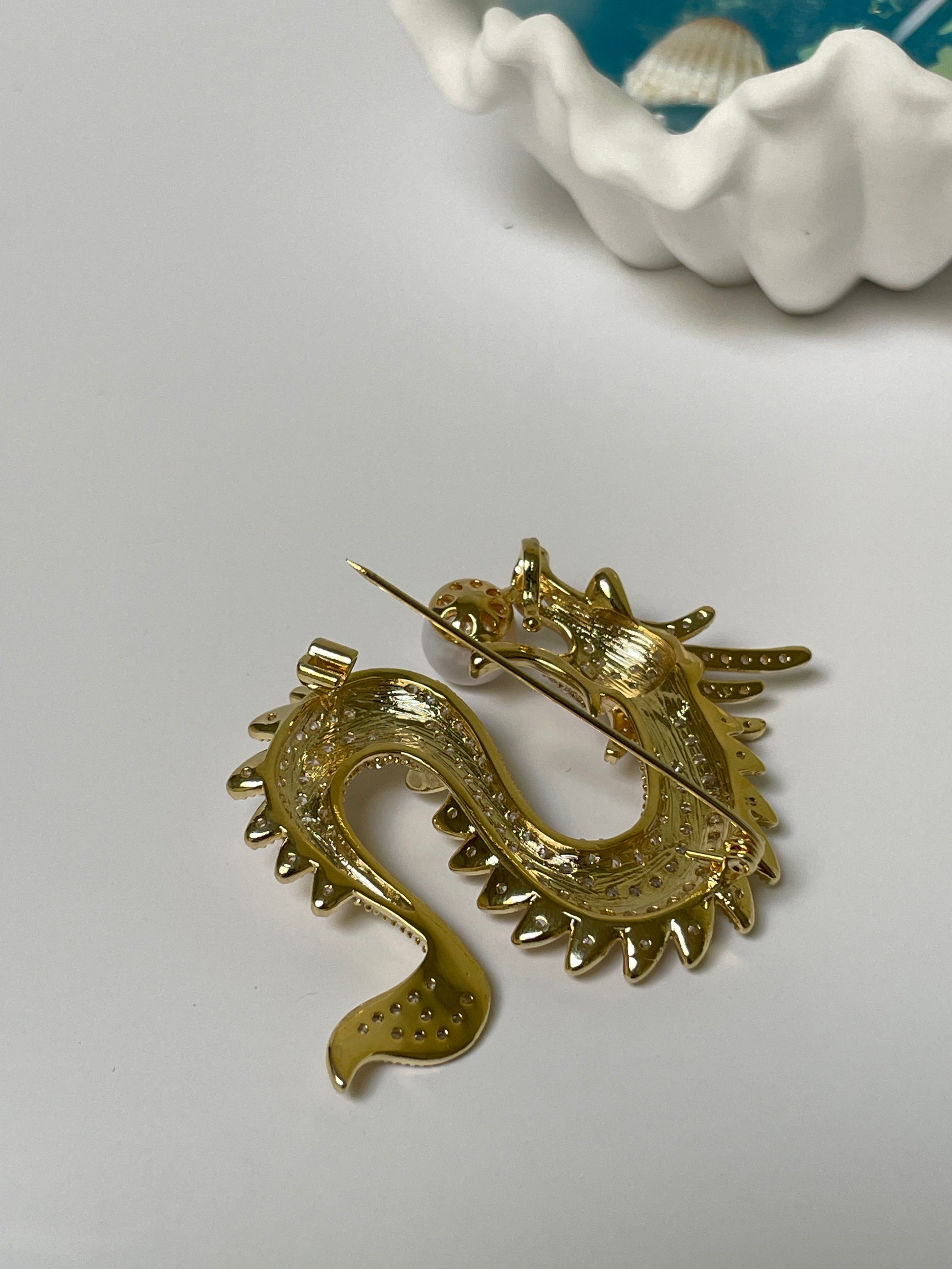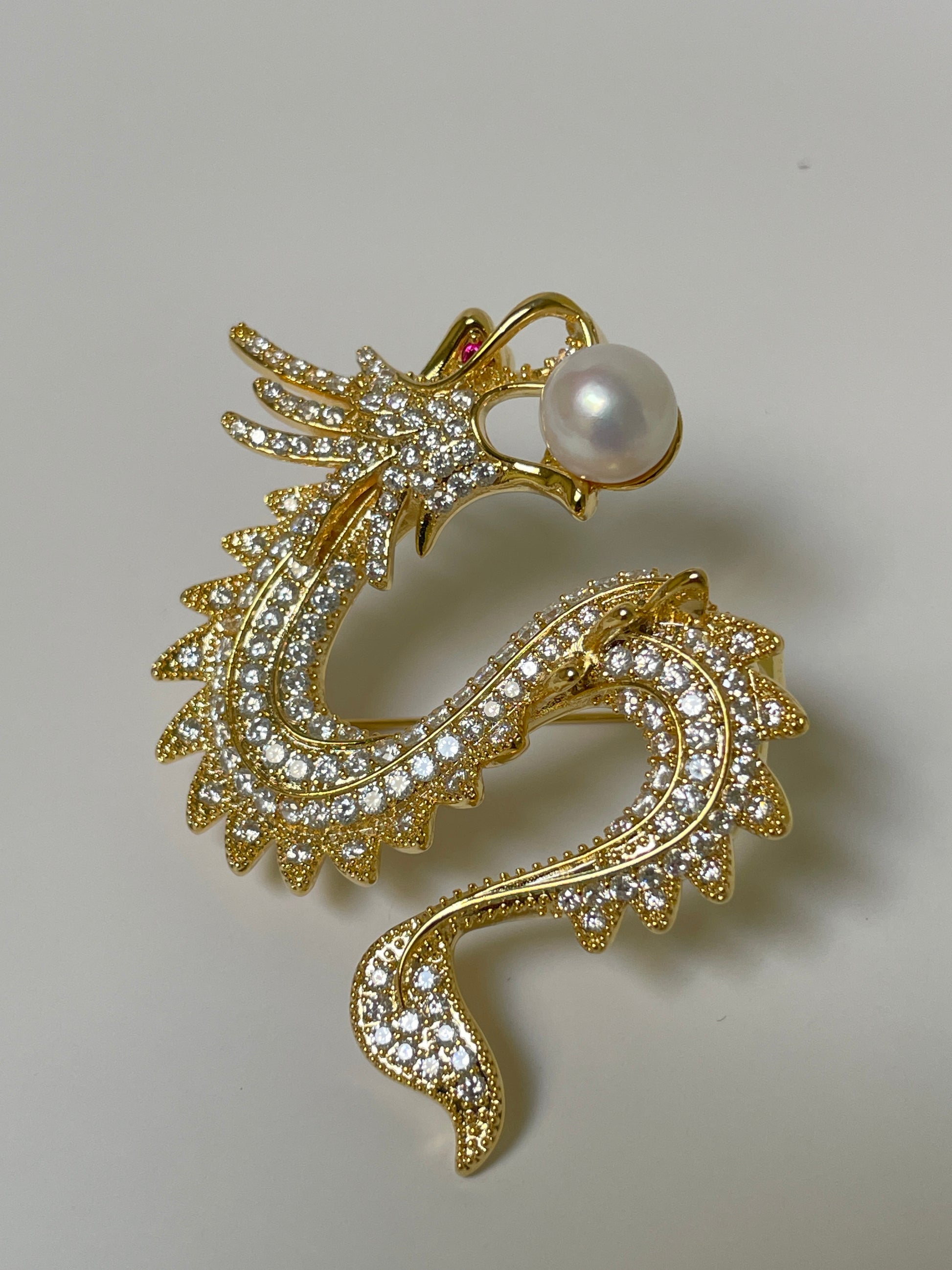 This intricate brooch features a striking “Golden Dragon Playing with the Pearl” design, crafted from gold-plated alloy and set with over a hundred tiny zircon stones. The 9–10mm freshwater pearl at the center is perfectly round with a silky, refined surface and exceptional luster—its radiant glow enhancing the symbolic beauty of the piece.
