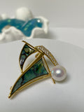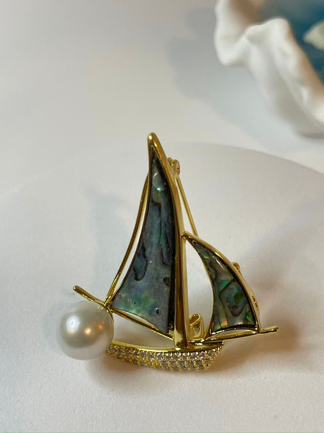 This beautifully symbolic brooch features a graceful sailboat design crafted from aluminum alloy, accented with shimmering mother-of-pearl and tiny zircon stones. The artistic concept is bold yet close to nature, capturing the spirit of smooth sailing and positive journeys ahead.