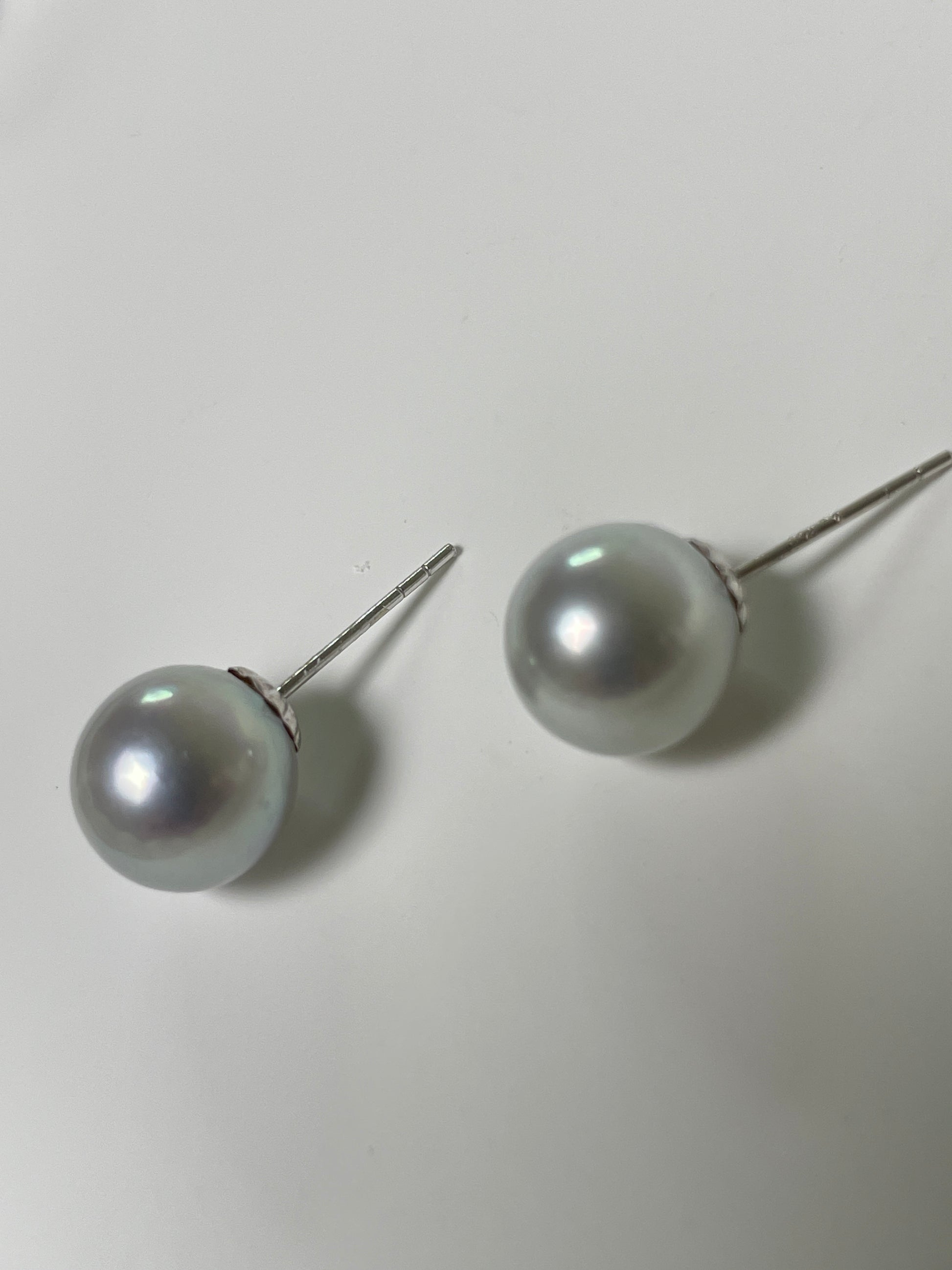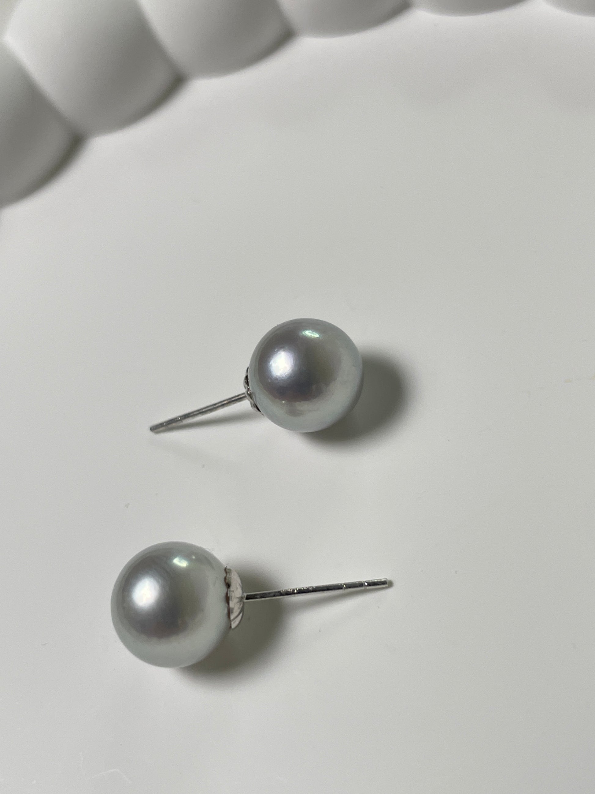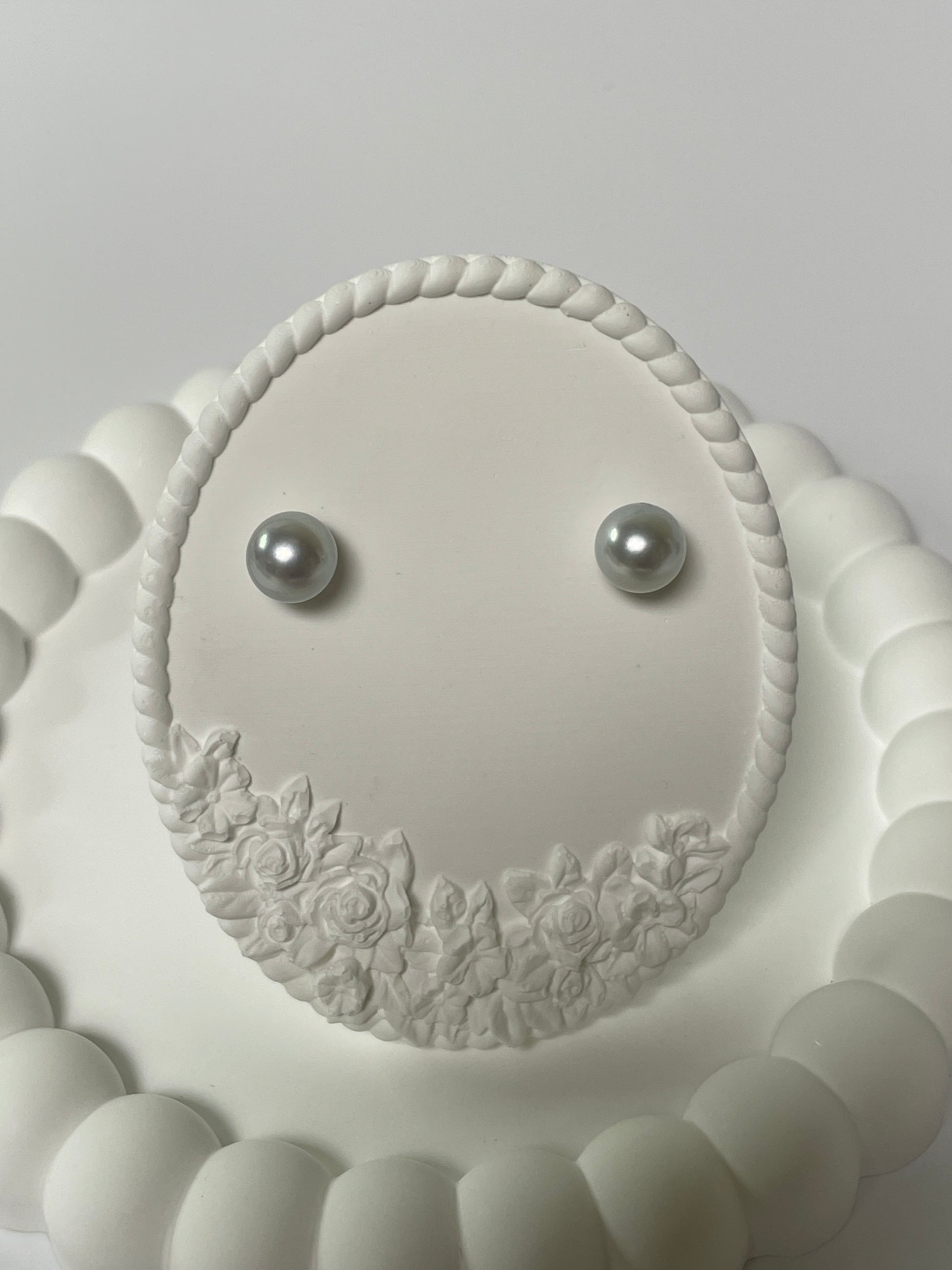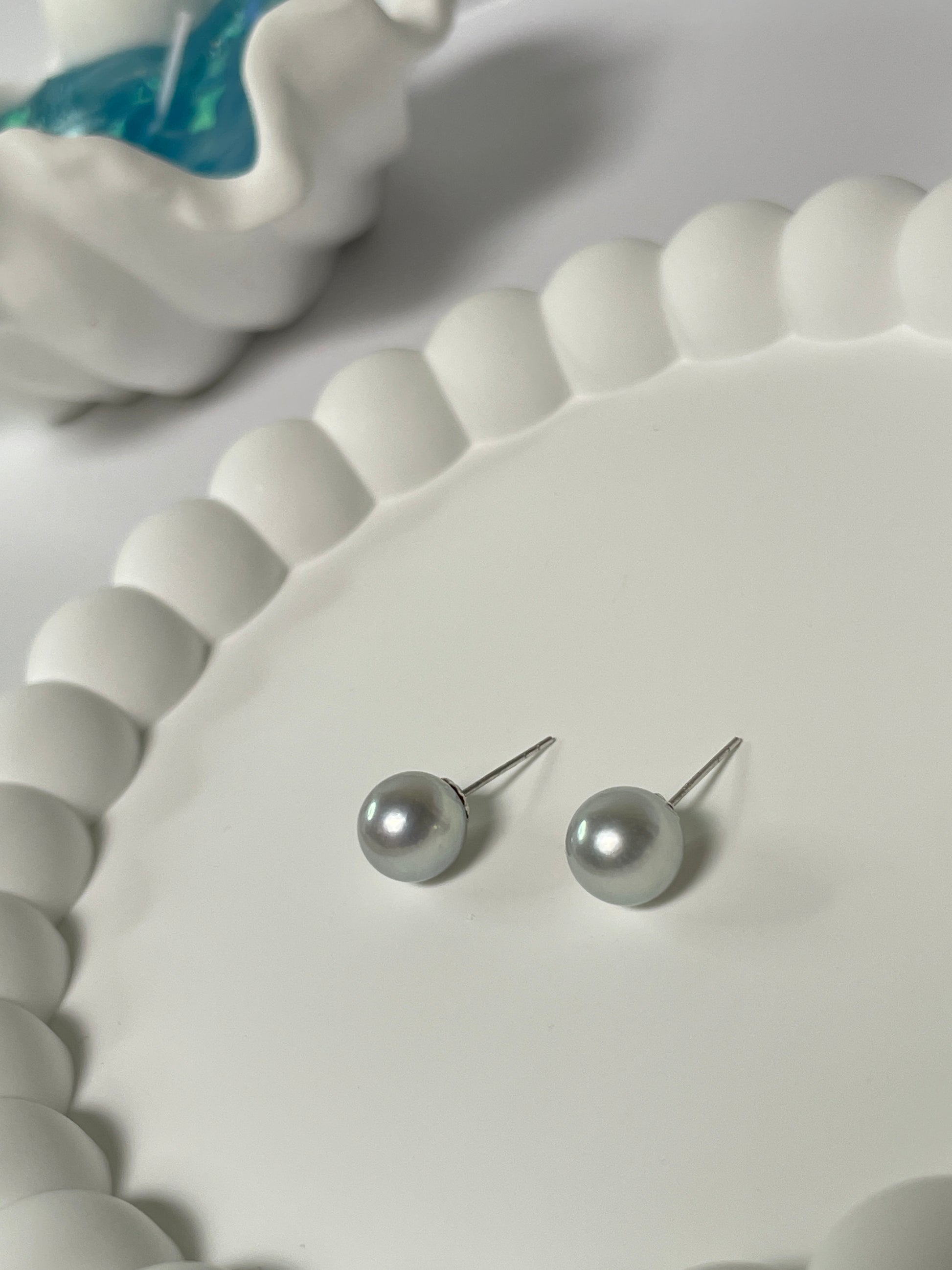 These sophisticated Akoya pearl stud earrings feature perfectly round 8.4–8.5mm pearls with an exceptionally smooth surface and brilliant luster. The pearls display a refined silver-gray tone illuminated by a subtle peacock-green overtone—an elegant signature of high-quality saltwater pearls. Under shifting light, the glow is striking yet effortlessly understated, giving these studs an undeniable presence despite their minimalist design.