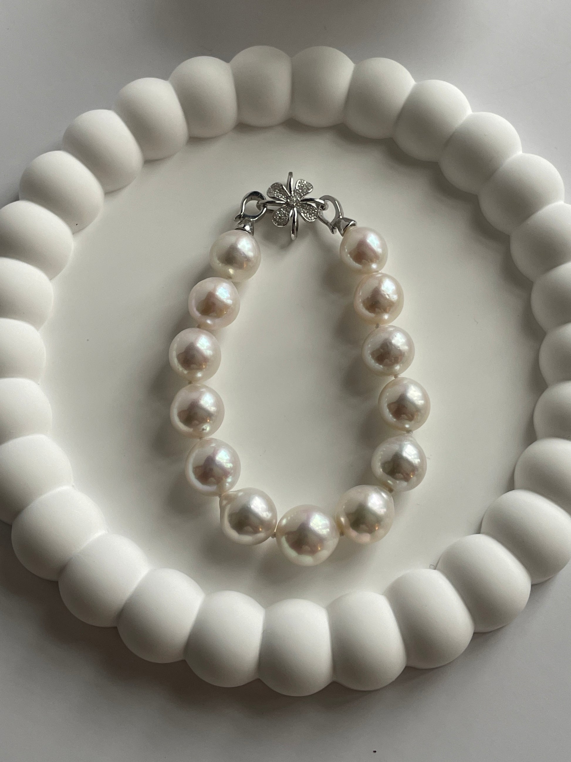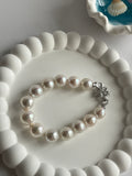 This bracelet features natural bright white freshwater pearls, each carefully selected for its near-flawless surface, smooth texture, and radiant, mirror-like luster. The pearls are fashionably sized between 10–12mm, creating a refined and elegant presence on the wrist.