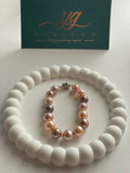 This bracelet features natural freshwater pearls in a rare alternating palette of iridescent purple and champagne. The colors are scarce and beautifully matched, creating a refined contrast that feels both elegant and distinctive.