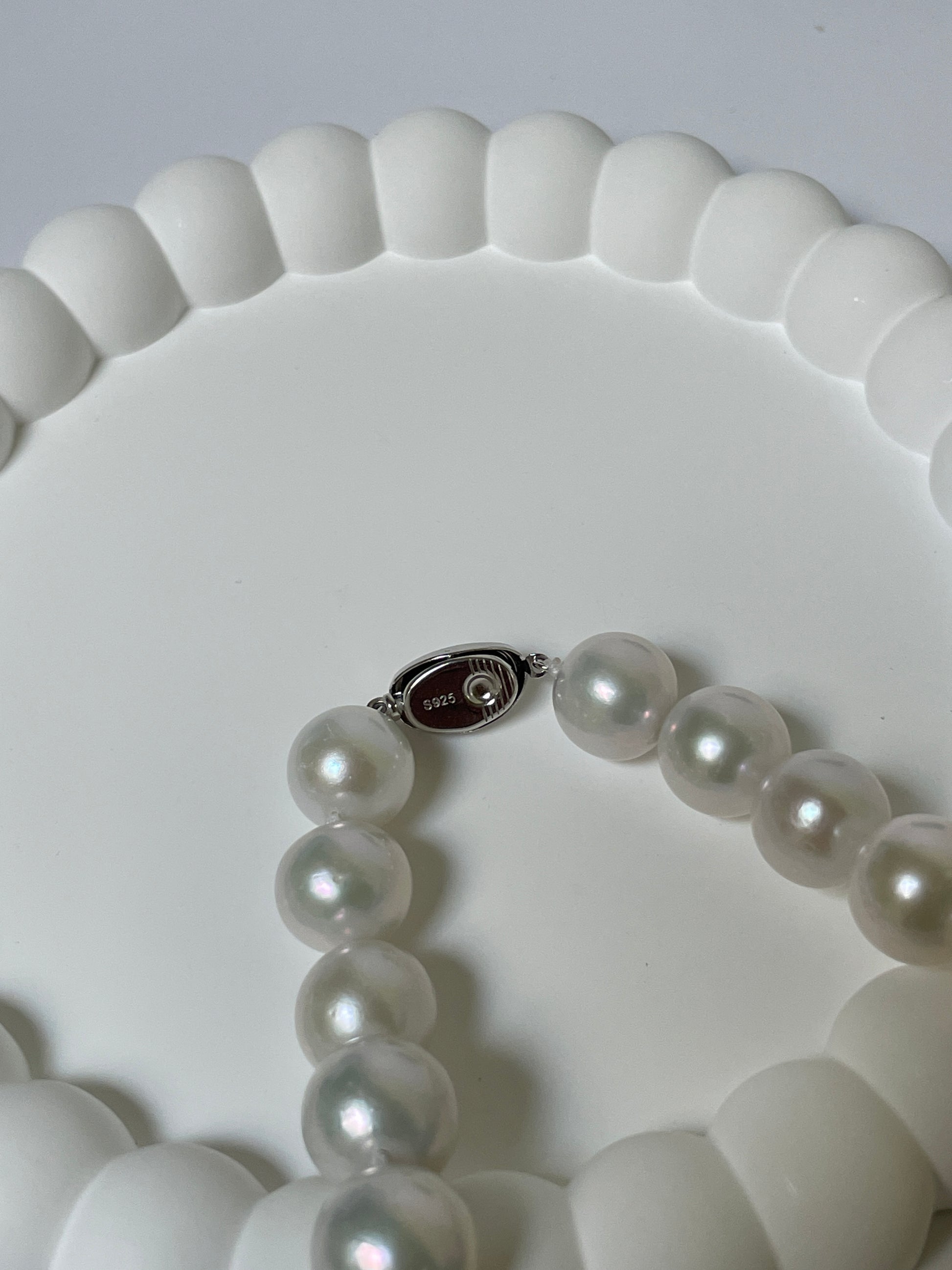 The generous pearl size and refined glow create a statement look that enhances both modern and classic outfits, making the necklace ideal for those who appreciate substantial, sophisticated jewelry. Its balanced proportions and smooth visual rhythm allow it to stand out without overwhelming the wearer.