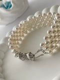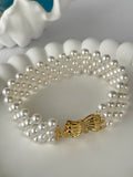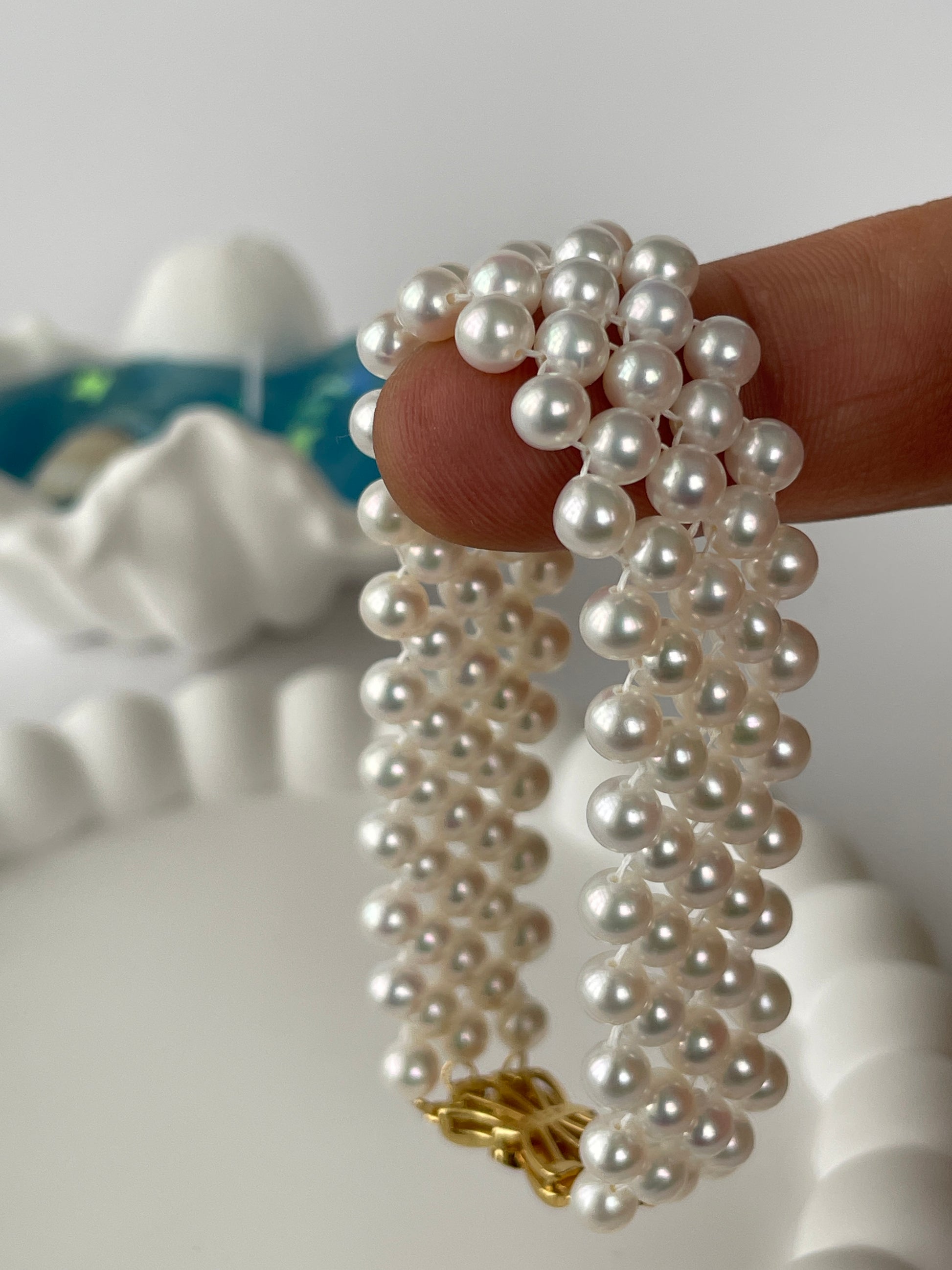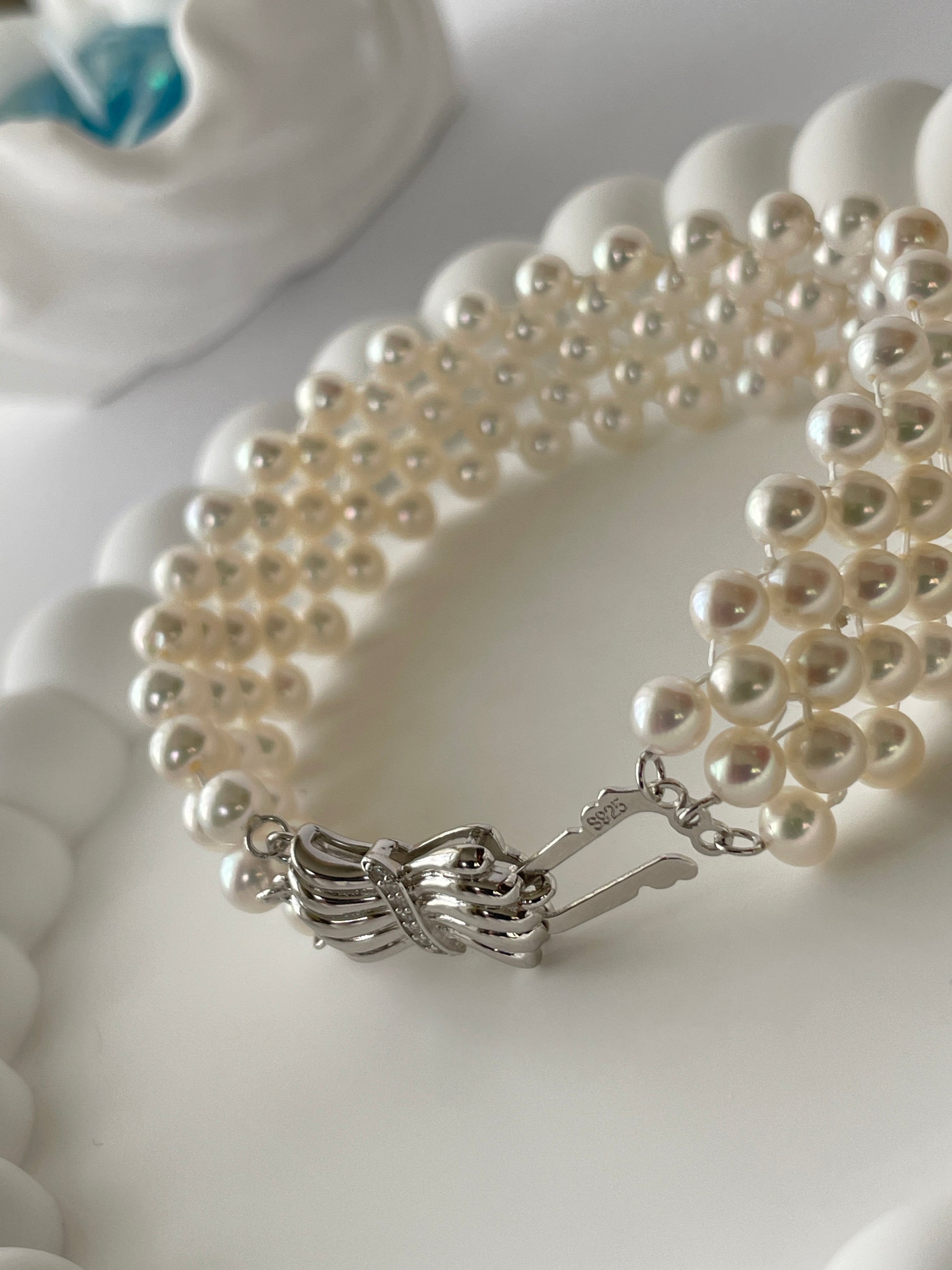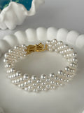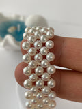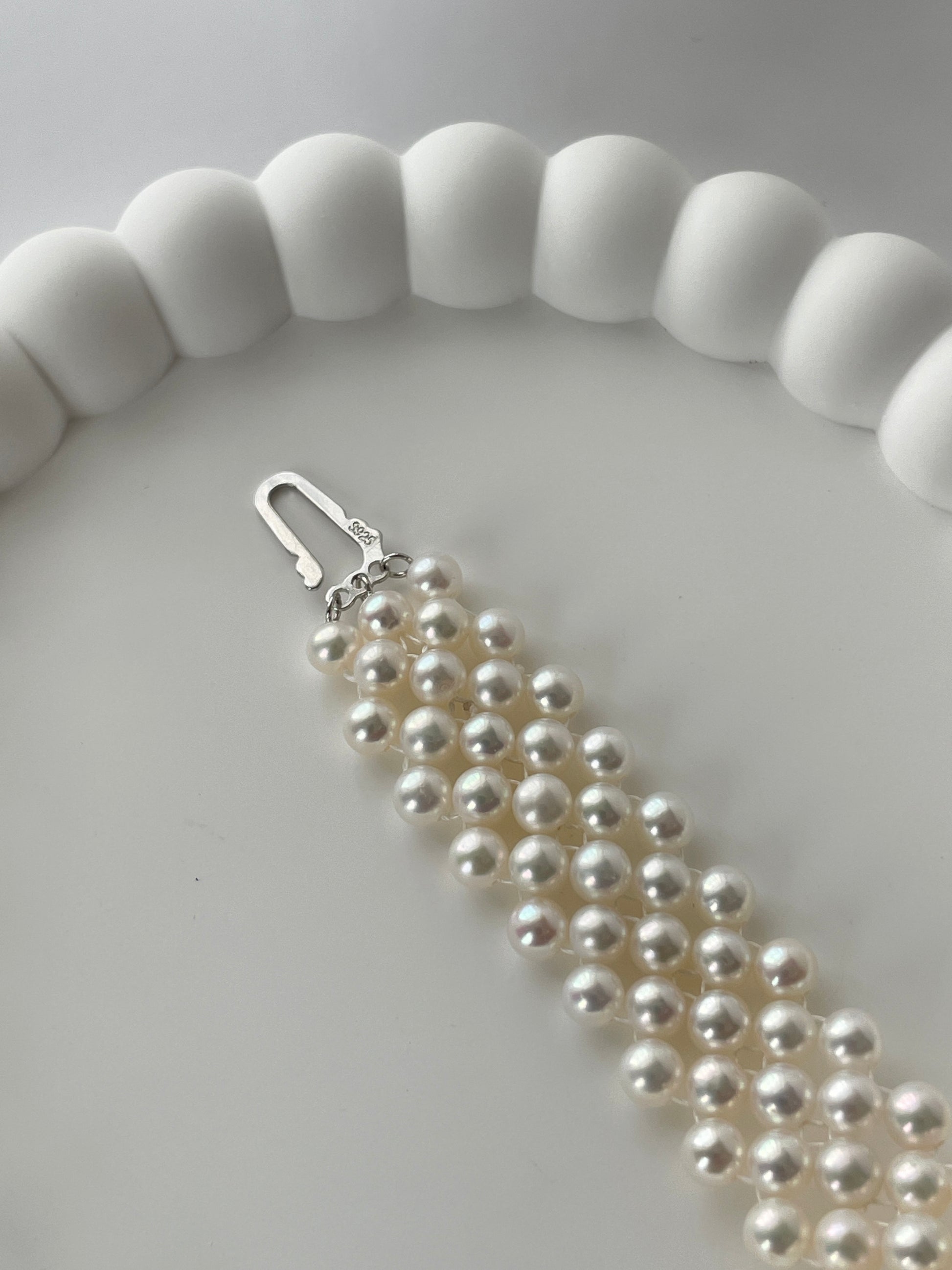 This wide-band bracelet is crafted with approximately 110 bright white freshwater pearls, each one selected for its near-perfect round shape, exceptionally smooth surface, and high-quality luminous sheen. The uniform glow and refined texture of the pearls make this piece stand out as a premium, meticulously crafted accessory.