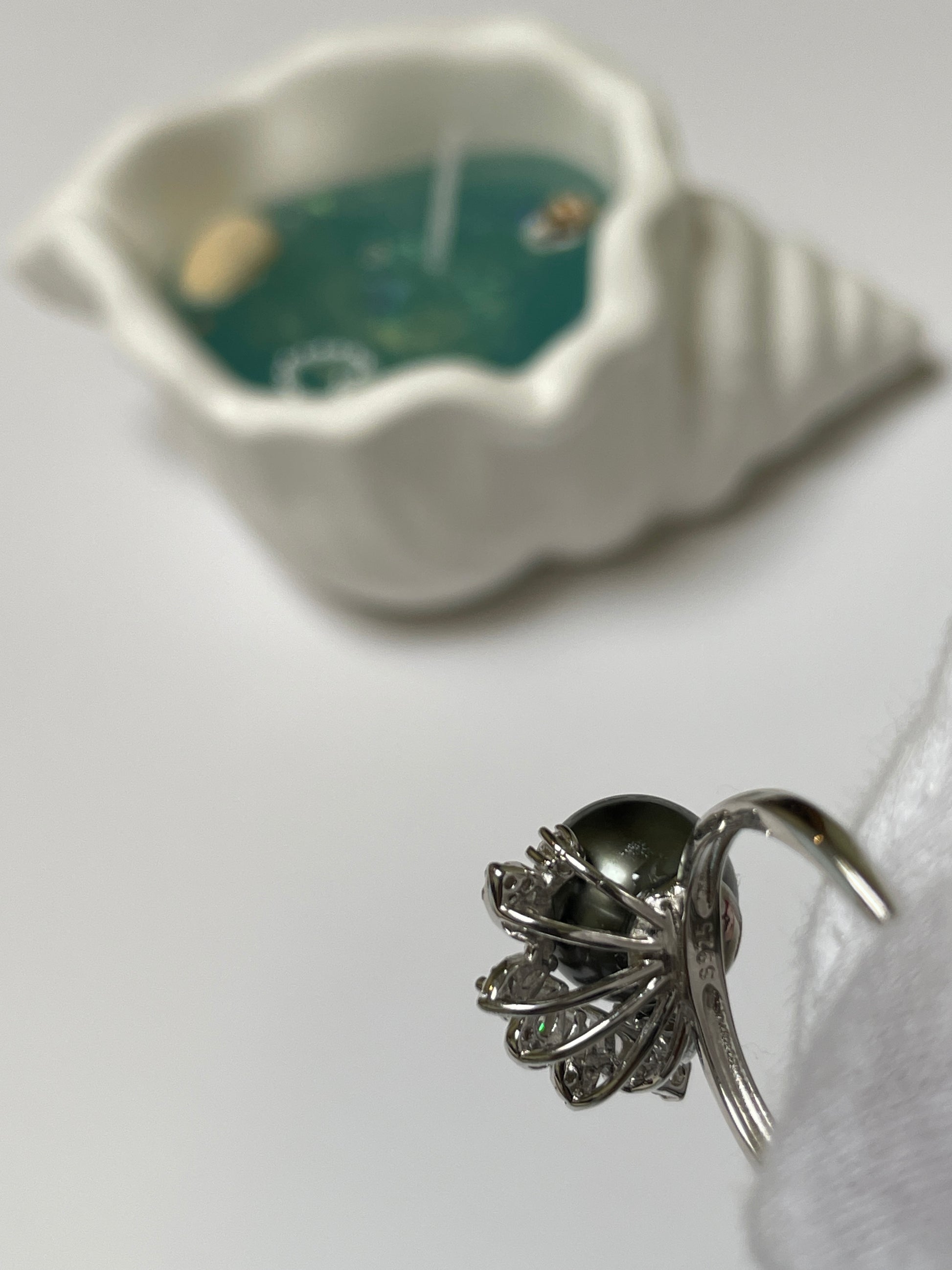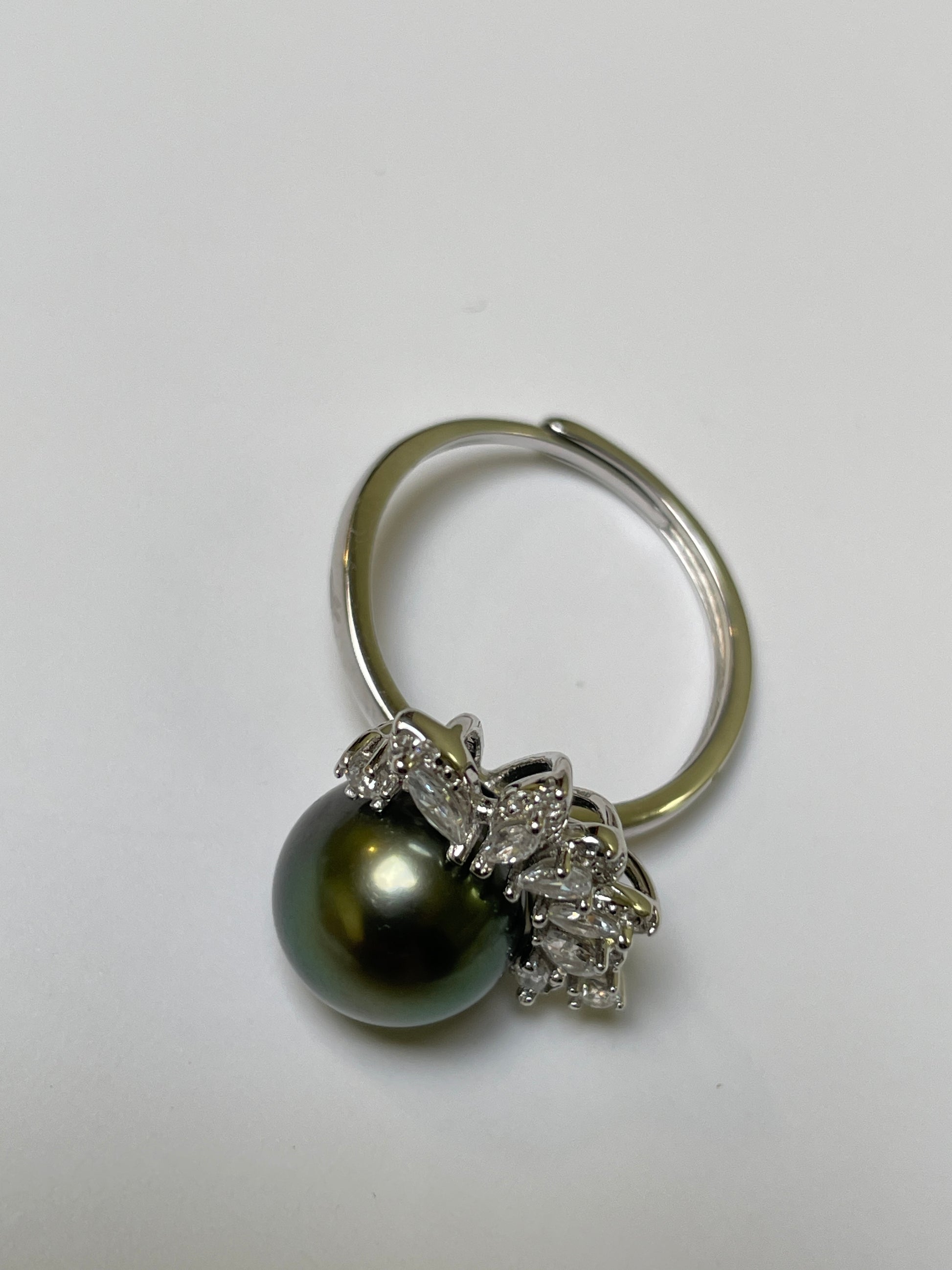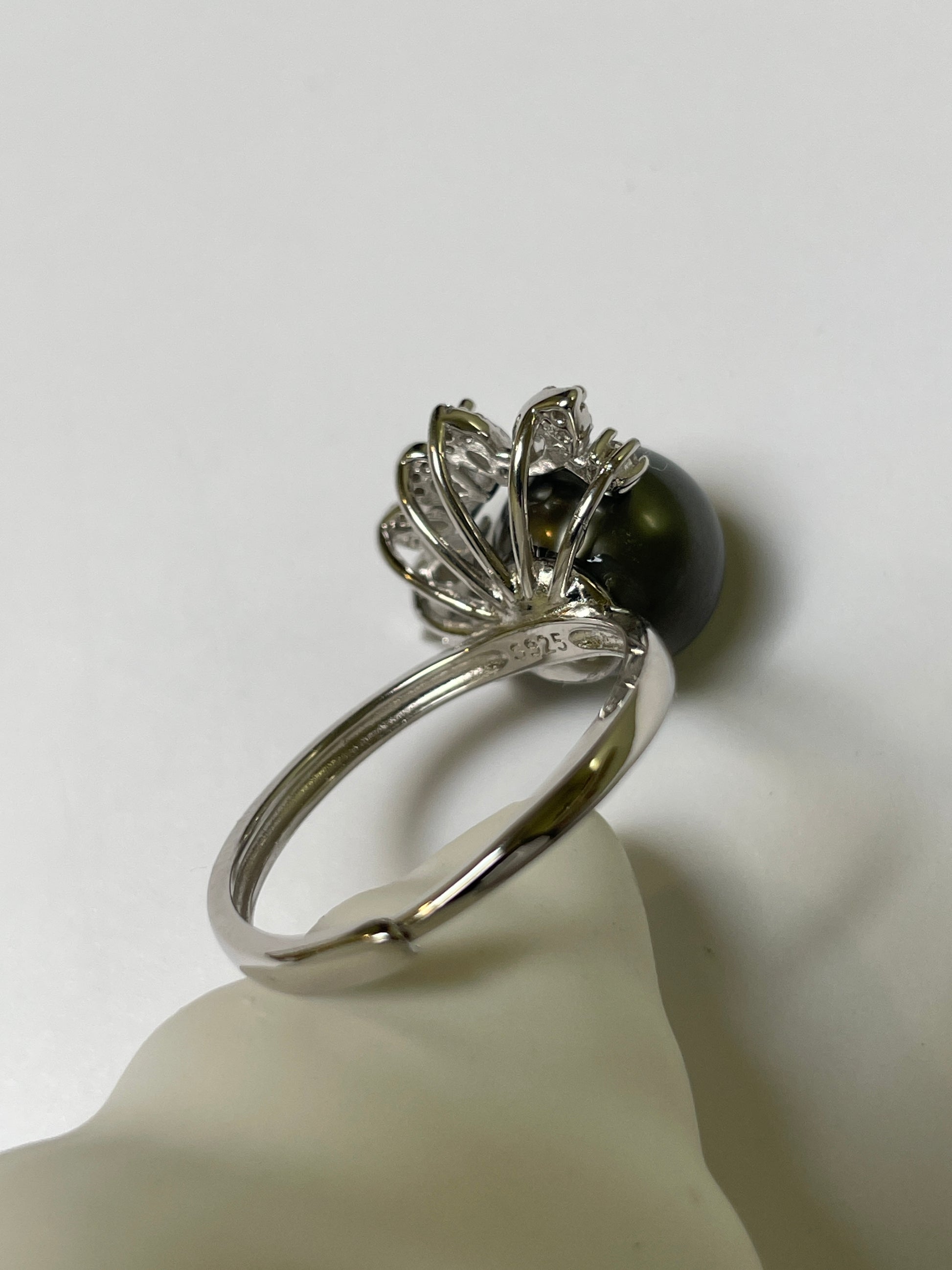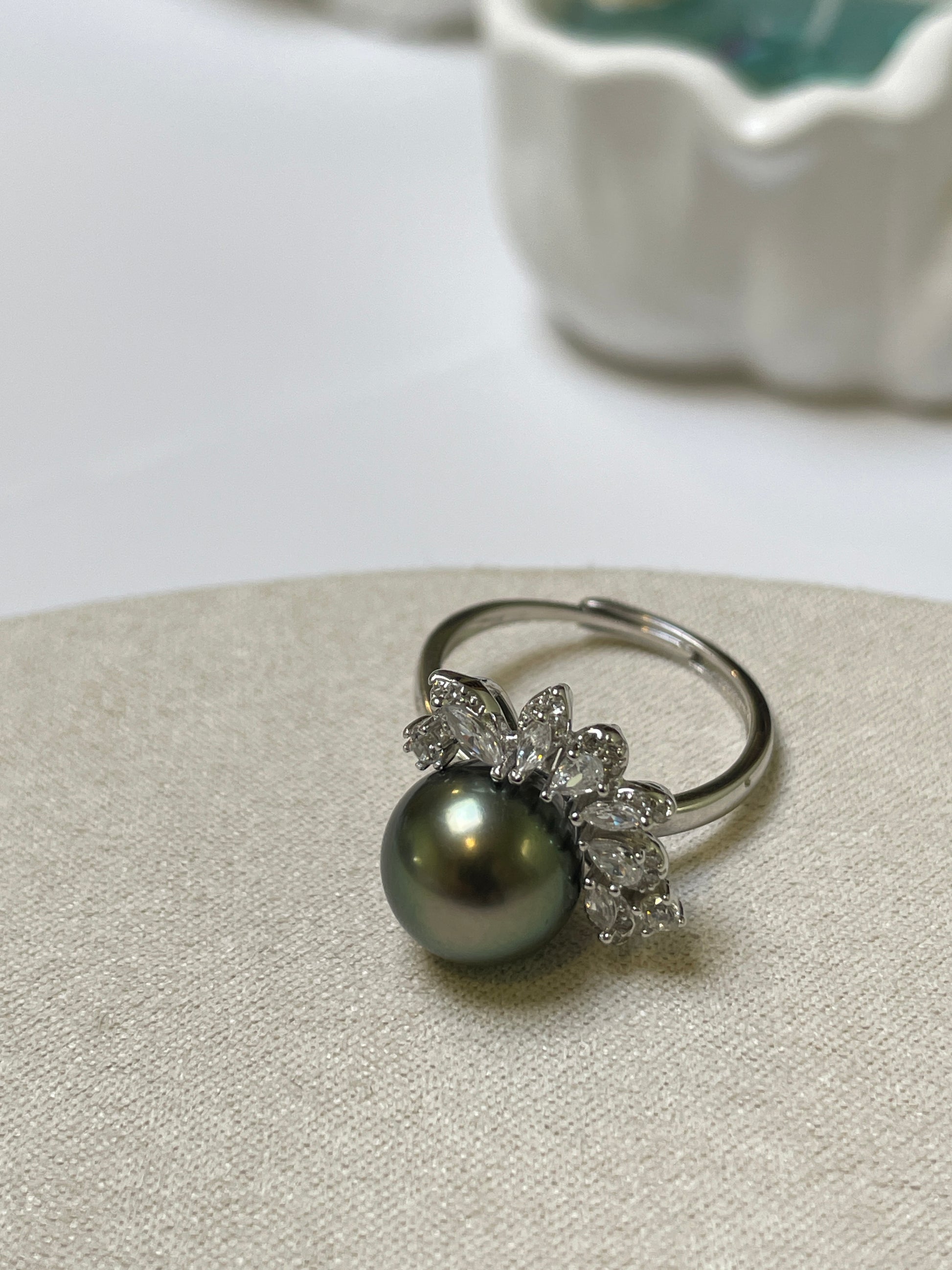 Tahitian Black Pearl Ring | 10–11mm · Peacock Green Overtone · Round · Zircon-Set 925 Sterling Silver